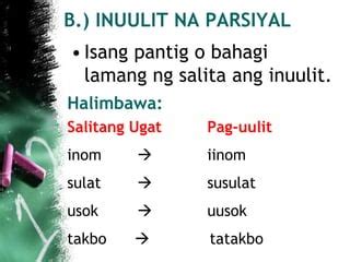 Mga Uri ng Pag-uulit - Tuklasin ang iba't ibang uri ng pag-uulit tulad ng pamamalitang unlapi, gitlapi, at hulapi.